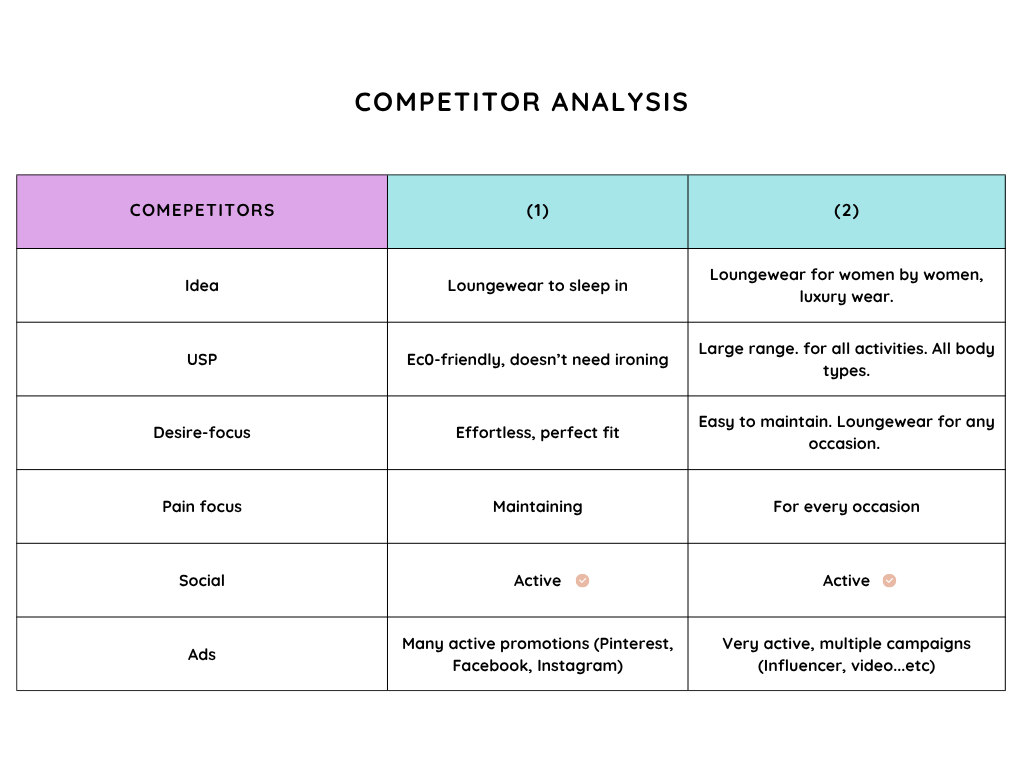 The following is a summary derived from 4 different competitors. It highlights essential factors from their sales tactics and unique selling propositions to how they create their ads, which you can get from ad libraries.